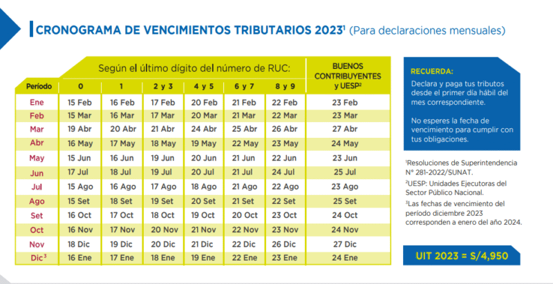 Obligaciones mensuales establecidas por la SUNAT en el cronograma de pagos 2023